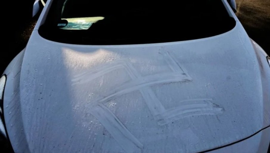 Policija je obaveštena kasno u sredu uveče kada je jedan muškarac primetio da je automobil premazan crvenkastom tečnošću. Tečnost je bila naneta u obliku svastike, dodali su iz policije.