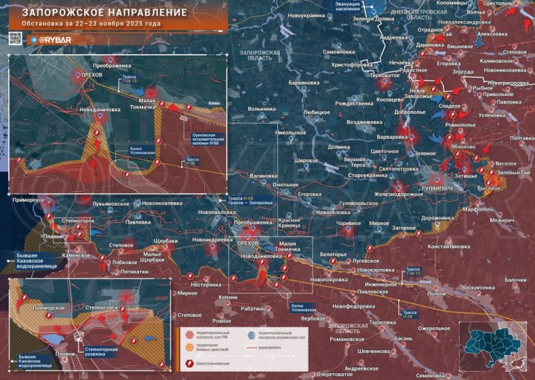U isto vreme, ruska artiljerija i jurišna avijacija intenzivno deluju po ukrajinskim položajima u gradu. Ukrajinski izvori tvrde da je u protekla 24 sata izvedeno 894 udara na 26 različitih naselja u Zaporožju. Ti podaci, bez obzira na to kolika je stvarna cifra, jasno ukazuju na obim ruskog pritiska i činjenicu da ukrajinske jedinice ne uspevaju da nađu ritam odbrane uprkos pokušajima rotacija.