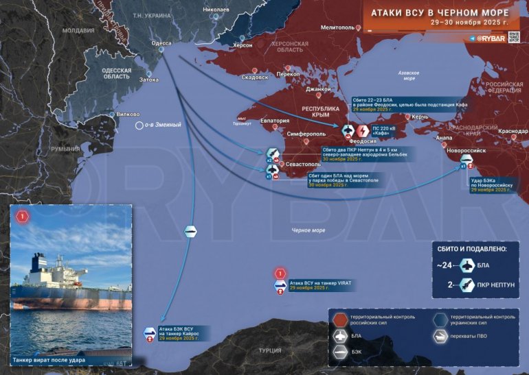 Analitičari su posebno skrenuli pažnju na napad ukrajinskog drona-kamikaze An-196 „Ljuti“ na tanker Midvolga-2, osamdesetak milja od turske obale. Snimci pokazuju ozbiljnu, ali ne i kritičnu štetu. Ostaci drona prikupljeni su na palubi radi analize. Eksperti smatraju da se ovaj tip drona obično koristi za napade na stacionarne ciljeve pomoću unapred zadanih koordinata, ali tragovi i konfiguracija ukazuju da je verovatno modifikovan dodatnim sistemom za upravljanje, verovatno preko Starlink terminala ili sličnog uređaja sa kamerom i direktnom vezom operatera, nalik modelima korišćenim u ukrajinskim napadima na Krim.