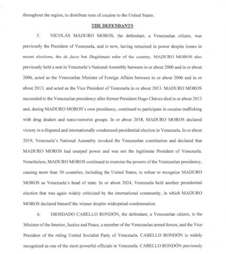 -Nikolas Maduro Moros, optuženi, je na čelu te korupcije i udružio se sa svojim saučesnicima da bi iskoristio svoj nezakonito stečeni autoritet i institucije koje je nagrizao da bi transportovao hiljade tona kokaina u Sjedinjene Države.