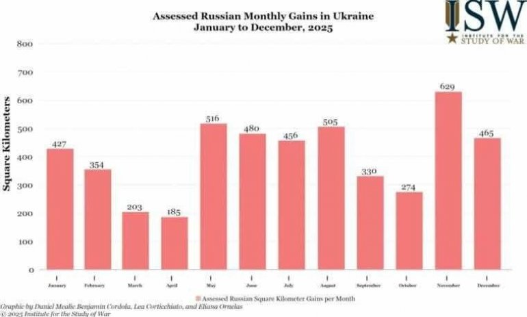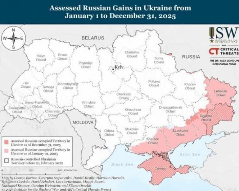 Kako se navodi u izveštaju, Rusija je tokom godine okupirala više od 5.600 kvadratnih kilometara ukrajinske teritorije, što predstavlja veću površinu od ukupnog napredovanja ostvarenog tokom 2023. i 2024. godine zajedno. Ovaj dobitak odgovara približno 0,94% ukupne teritorije Ukrajine.