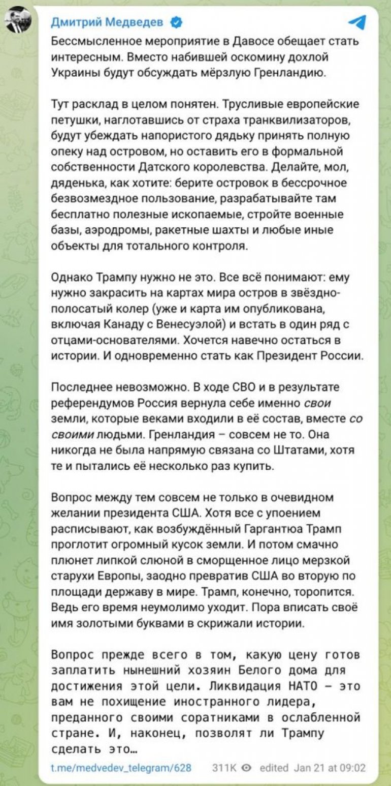 ZAMENIK predsednika Saveta bezbednosti Rusije Dmitrij Medvedev izjavio je da bi američko zauzimanje Grenlanda bilo manje legitimno od pretenzija Moskve na ukrajinsku teritoriju, budući da Rusija vraća zemlje koje su vekovima bile deo Ukrajine.