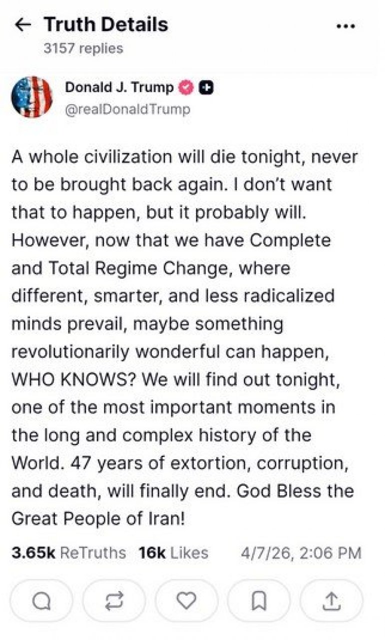 AMERIČKI predsednik Donald Tramp je upravo objavio na svojoj društvenoj mreži"Truth Social" , da će cela iranska civilizacija umreti večeras, ukoliko se ne postigne dogovor o okončanju sukoba.