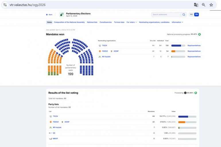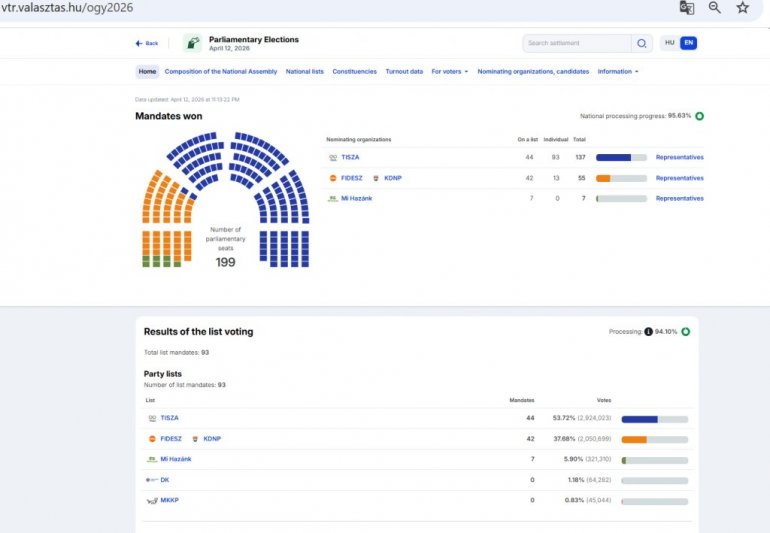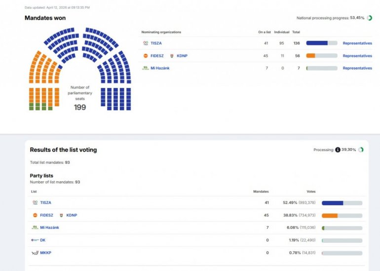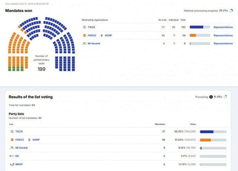 Na osnovu 93.42% odsto prebrojanih glasova opoziciona stranka Tisa osvojila je 138 mandata (44 sa lista, 94 pojedinačno), dok je vladajući Fides dobio 54 mandata (42 sa lista, 12 pojedinačno) u mađarskom parlamentu, navedeno je na sajtu Nacionalne izborne komisije Mađarske.