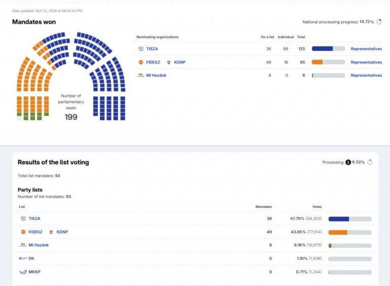 Na sajtu Nacionalne izborne kancelarije objavljeni su prvi brojevi, na osnovu kojih Fides-KDNP vodi na nacionalnoj listi sa 1,37 odsto glasova, Tisa stranka je druga, dok je Mi Hazank na trećem mestu, i dalje u konkurenciji.