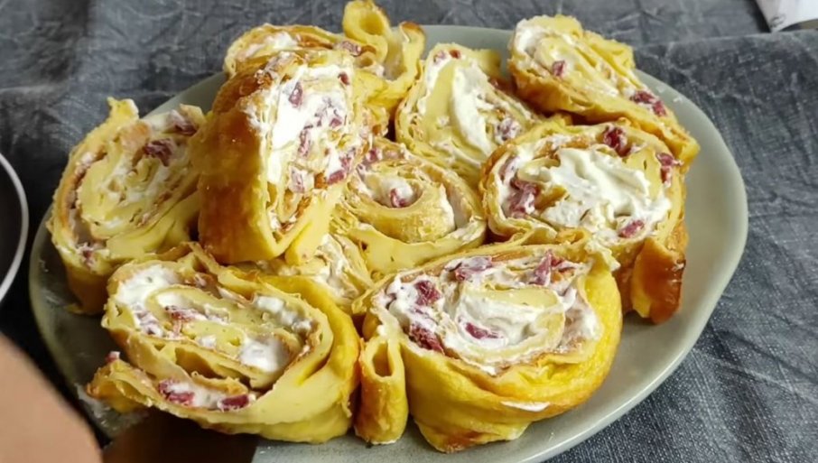 Za fil: Pomešati sir, pavlaku i so i dobro sjediniti. Okrenuti testo na drugu stranu i premazati ga filom, a zatim dodati sitno seckanu šunku ili čajnu. Urolati ga u rolat. Iseći i služiti.
