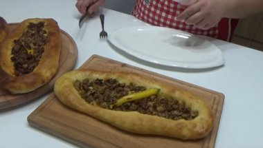 Dok testo raste, pripremite meso. Isecite svinjski vrat na sitne komade. U posudu stavite meso, dodajte mlevenu crvenu papriku, so i biber po ukusu. Dobro izmešajte. Kada testo naraste, podelite ga na dva dela. Svaki deo razvucite u ovalni oblik debljine oko 1 cm. Na sredinu svakog ovala stavite pripremljeno meso. Zagrejte rernu na 220°C. Stavite pastrmajlije na pleh obložen papirom za pečenje. Ako želite, možete premazati ivice testa umućenim jajetom za lepšu boju. Pecite pastrmajlije u zagrejanoj rerni oko 20-25 minuta, dok testo ne postane zlatno smeđe, a meso pečeno.