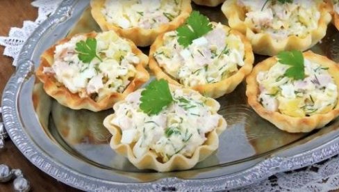 SLAVSKE korpice filuju se dimljenom piletinom, krompirom, jajetom i sirom, vrlo su zgodne kao predjelo i zalogajčići na proslavama.