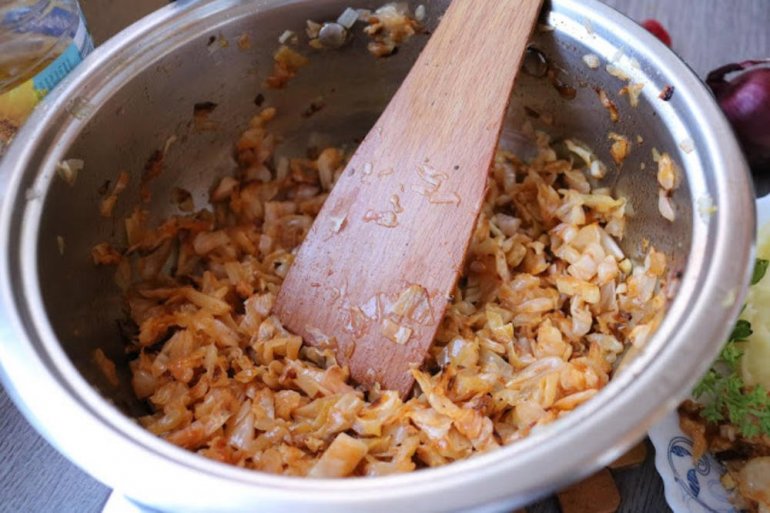 Potrebno: glavica kiselog kupusa, 2 glavice crnog luka, lovorov list, 1/2 kašike aleve paprike, 2 kašike ulja, biber u zrnu.