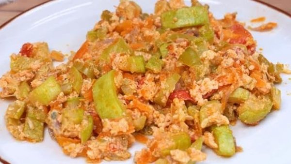 Tikvice isecite na kockice, pa posolite i promešajte. Ostavite da odstoje 10 minuta, pa procedite višak vode. U tiganju zagrejte malo maslinovog ulja, pa propržite ljubičasti luk isečen na rebarca, kao i mleveni beli luk. Kada omekša dodajte paprike isečene na trake, kao i rendanu šargarepu. Posolite, promešajte i poklopite. Dinstajte 5 minuta, pa dodajte proceđene tikvice. Poklopite i kuvajte dok povrće ne omekša. Zatim dodajte iseckan paradajz i paradajz sos. Promešajte, pa dodajte umućena jaja koja ste začinili po želji. Kuvajte dok i jaja ne budu gotova, uz povremeno mešanje.