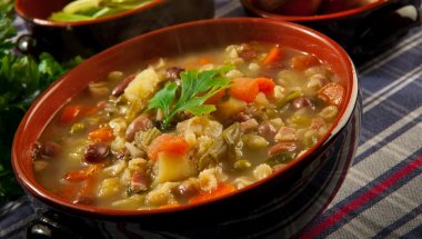 Umešajte paradajz sos, goveđu supu, začine, pasulj, šargarepu, pečurke i preostale sastojke. Dovesti do ključanja. Smanjite temperaturu; poklopite i kuvajte 1 sat ili dok povrće ne omekša. Izvadite lovorov list i uživajte!