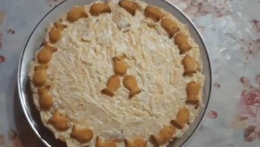 Konzervu tunjevine izgnječiti viljuškom, dodati majonez i dobro promešati. Luk iseckati na kockice, a šargarepu ispržiti na ulju dok ne omekša. Narendati sir i beli luk, dodati majonez i sve dobro promešati. U odgovarajuću posudu rasporediti salatu u slojevima: prvi sloj krekera, zatim sloj tunjevine, sledeći sloj krekera, pa sloj sira, belog luka i majoneza. Ponoviti slojeve dok ne iskoristite sve sastojke.