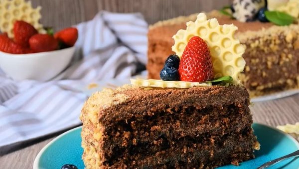 - Za koru pomešajte 230 g mlevenih oraha, med, 230 g šećera, kiselu vodu, 3 štangle rastopljene čokolade, 3 kesice vanilin-šećera, ulje, brašno i kašičicu praška za pecivo. Masu sipajte u podmazan pleh i ispecite. Ohladite i presecite na tri dela. Za fil ušpinujte 450 g šećera s malo vode, dodajte 450 g mlevenih oraha i 3 štangle rendane čokolade. U ohlađenu masu dodajte 200 g penasto umućenog margarina sa 3 kesice vanilin-šećera. Nafilujte tortu, isecite na kocke i pospite struganom čokoladom.