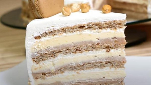 Kora: 4 belanca umutite sa postepenim dodavanjem šećera. Sjedinite 4 kašike mlevenih lešnika i kašiku brašna, pa dodajte u umućena belanca. Promešajte lagano i sipajte u okrugli kalup veličine 26 cm. Pecite u zagrejanoj rerni na 200 °S oko 15 minuta ili zavisno od vaše rerne. Na isti način pripremite i preostale 3 kore.