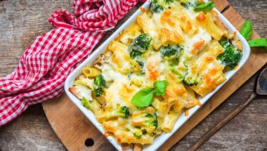 Zagrejte rernu na 200 °C. Makarone kuvajte u slanoj vodi 5 minuta. Nasecite brokoli na male cvetove, dodajte u šerpu i kuvajte još 3 minuta dok makaroni i brokoli ne omekšaju. Ocedite i prebacite u vatrostalnu posudu.