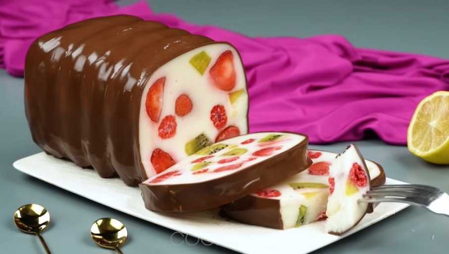 U šerpu sipajte šećer, želatin i mlekom. Kuvajte dok se šećer lepo ne otopi, uz neprestano mešanje. Sklonite sa strane i ostavite da se ohladi nekih 20 minuta. Iseckajte voće, pa poređajte u gumeni kalup (veličine kao za hleb). Zatim sipajte mleko i malo promešajte, pa pokrijte providnom folijom i stavite u frižider na 4 sata. U šerpi pomešajte šećer, mleko, želatin i kakao i kuvajte uz neprestano mešanje. Kada smesa krene da vri dodajte čokoladu i isključite šporet. Mešajte dok se čokolada ne istopi. Na veću tacnu stavite rešetku, pa na nju kolač koji ste izvadili iz kalupa. Prelijte kolač i vratite u frižider na pola sata.