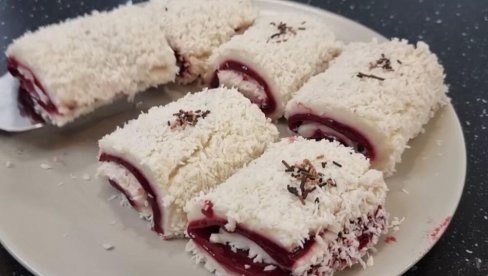 Kada se kolač ohladi isecite ga na 12 jednakih delova u obliku pravougaonika, pa zatim svaki od njih urolajte rukama da izgledaju kao prave male rolnice, tako da spolja ostane deo sa kokosom, a iznutra sa "džemom".