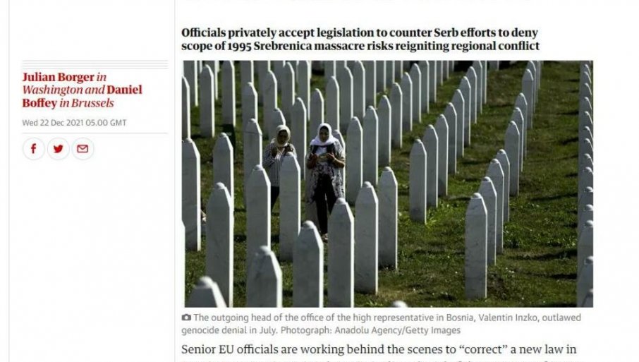 VISOKI zvaničnici EU rade iza kulisa na "ispravljanju“ novog zakona u Bosni i Hercegovini koji nalaže kazne za poricanje navodnog masakra 8.000 muslimana u Srebrenici, nakon što su privatno zaključili da rizikuje pokretanje novog regionalnog sukoba, piše britanski Gardijan.