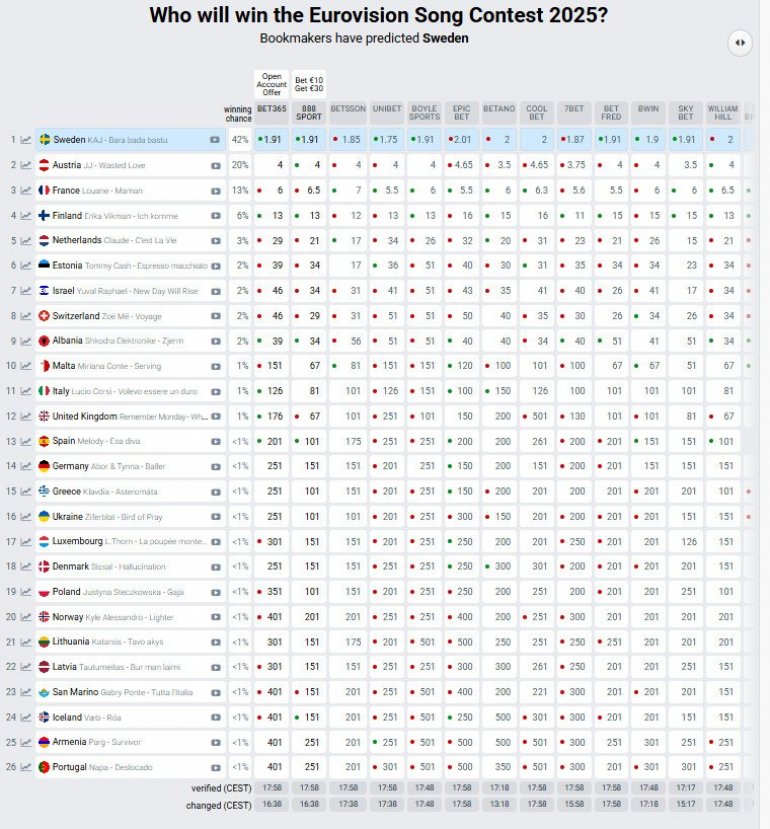 Kladionice kažu - Švedska! Na kladionicama širom sveta je takođe poprilično gusto. Kako se može videti na sajtu "Eurovisionworld", gde se detaljno prati stanje i prikupljaju podaci, ubedljivu pobedu odneće Švedska, ako je suditi po tabeli.