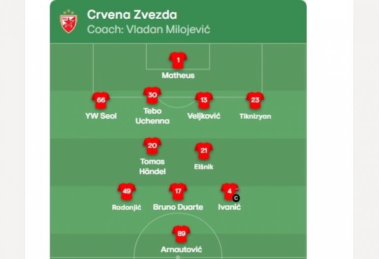 Crvena zvezda: Mateus - Seol, Tebo Učena, Veljković, Tiknizjan - Handel, Elšnik, Radonjić, Ivanić - Duarte, Arnautović