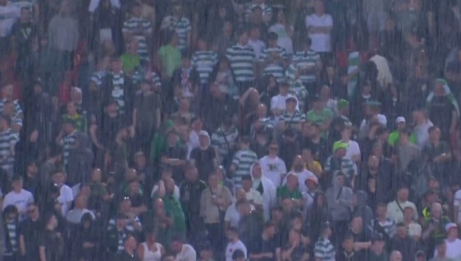 20.57 - Kiša i daljee jako pada, pa je deo navijača na istočnoj tribini rešio da se povuče u gornje redove, gde krov pomaže prilikom padavina