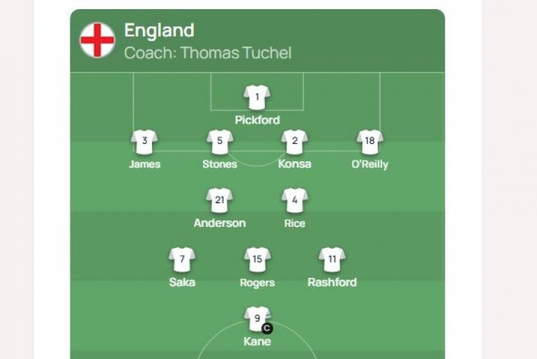 Engleska: Pikford, Konsa, Džejms, Rajs, Stons, Rodžers, O'Rajli, Anderson, Saka, Rašford, Kejn