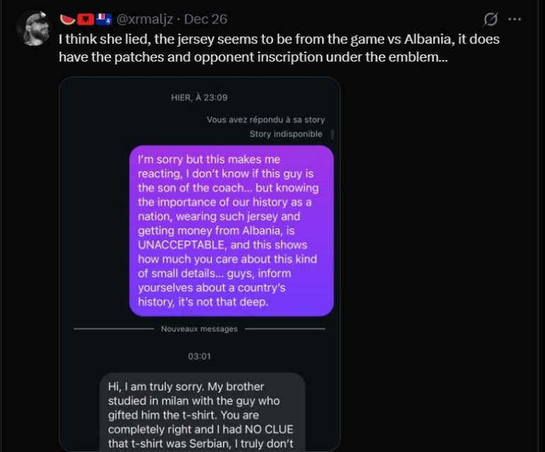 - Iskreno mi je žao. Moj brat je studirao u Milanu sa momkom koji mu je poklonio dres. Potpuno si u pravu i nisam imala predstavu da je to dres Srbije, stvarno ne pratim fudbal. Već je obrisano i neće se ponoviti. Hvala na razumevanju - napisala je Tati Mendeš.