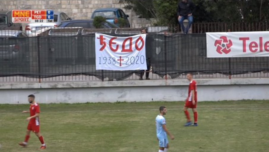 U Petrovcu je danas nakratko prekinuta fudbalska utakmica dva crnogorska tima zvog transparenta posvećenom preminulom mitropolitu Amfilohiju.