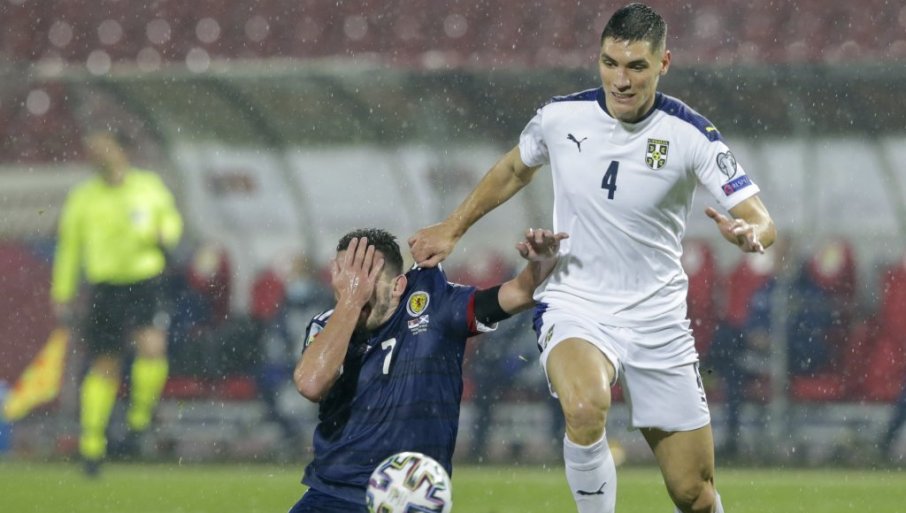 7. MINUT - Mekgin je pokušao da stigne centaršut, ali je zakasnio. Bila je to prva polu-prilika za Škote. Gosti su krenuli sa visokim pritiskom na zadnju liniju Srbije kada štoperi imaju posed lopte.
