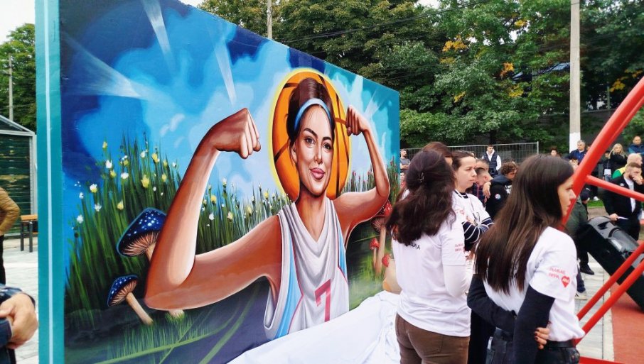 Tik uz teren umetnica iz Paraćina Marija Komarac oslikala je mural sa likom mlade košarkašice, koji će stalno podsećati na to u čiju čast je teren napravljen.