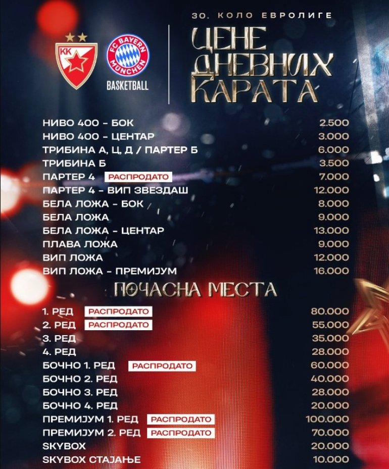 Cene karata za utakmicu sa Bajernom iz Minhena su sledeće i možete ih pogledati u grafičkom prikazu ispod teksta", zaključuje se u saopštenju crveno-belih i dodaje ovaj cenovnik, na kome se videti koje karte su već rasprodate: