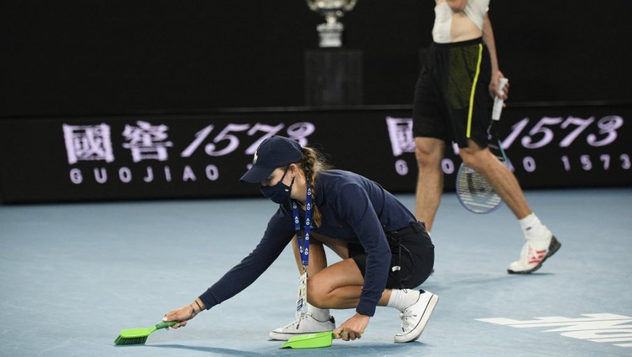 Razbio je najbolji teniser sveta rekvizit u paramparčad, toliko da je proglašena pauza a devojčica koja skuplja lopte izašla na teren sa metlicom i lopaticom, da počisti krhotine.