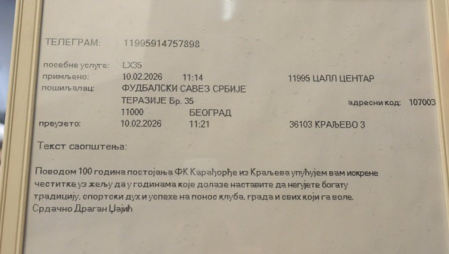 - POVODOM sto godina postojanja Fudbalskog kluba Karađorđe, upućujem vam najiskrenije čestitke uz želju da u godinama koje dolaze nastavite da negujete bogatu tradiciju, sportski duh i uspehe na ponos kluba, grada i svih koji ga vole. Srdačno, Dragan Džajić – navodi se u telegramu predsednika FS Srbije.