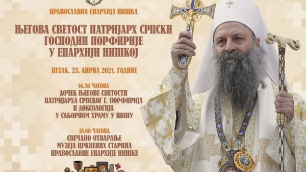 PATRIJARH srpski gospodin Porfirije otvoriće u petak Muzej crkvenih starina pravoslavne Eparhije niške, u kojem će biti izložene umetničke slike i crkvene starine koje potiču sa prostora Niške mitropolije, a to će bit ii njegova prva poseta tom gradu od izbora za poglavara Srpske pravoslavne crkve.