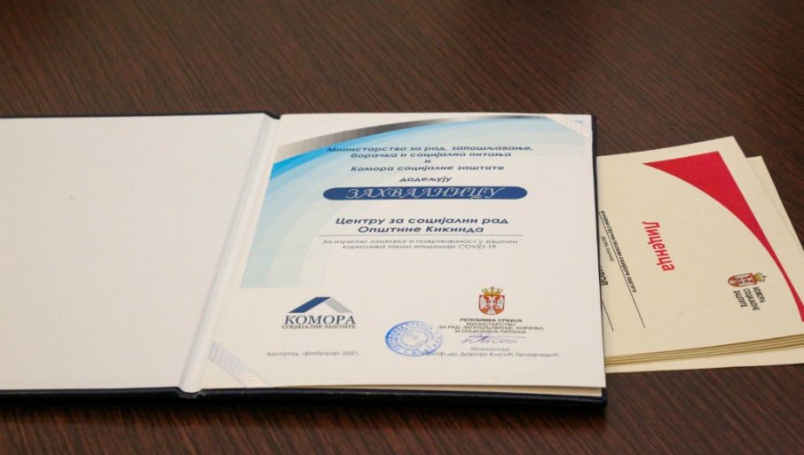 MINISTARSTVO za rad, zapošljavanje, boračka i socijalna pitanja i Komora socijalne zaštite dodelili su zahvalnicu kikindskom Centru za socijalni rad za izuzetno zalaganje i požrtvovanost u zaštiti korisnika tokom pandemije korona virusa. Istovremeno su sva stručna lica dobila i licence.