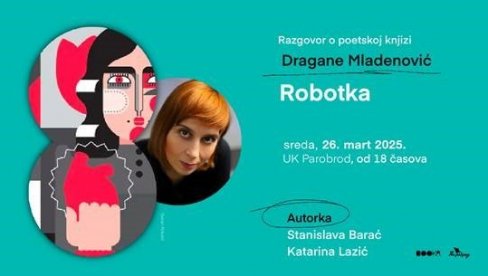 NOVA zbirka poezije "Robotka" Dragane Mladenović, nedavno nagrađene priznanjem "Milica Stojadinović Srpkinja", održaće se u sredu, 26. marta, u Ustanovi kulture "Parobrod".