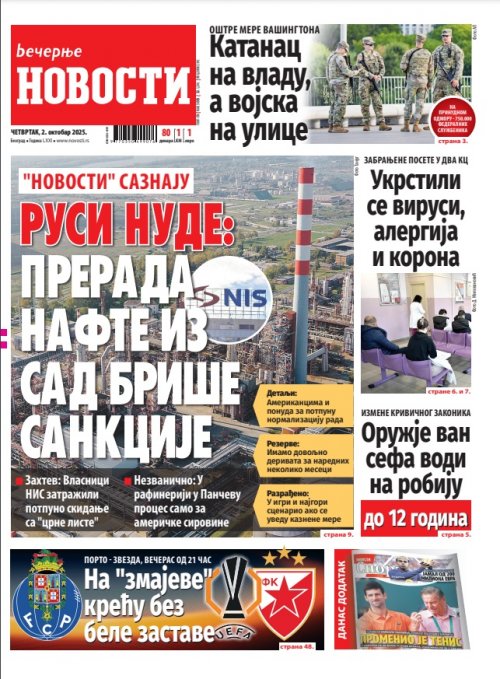 Večernje novosti - Naslovna strana - Štampano izdanje za 02.10.2025.