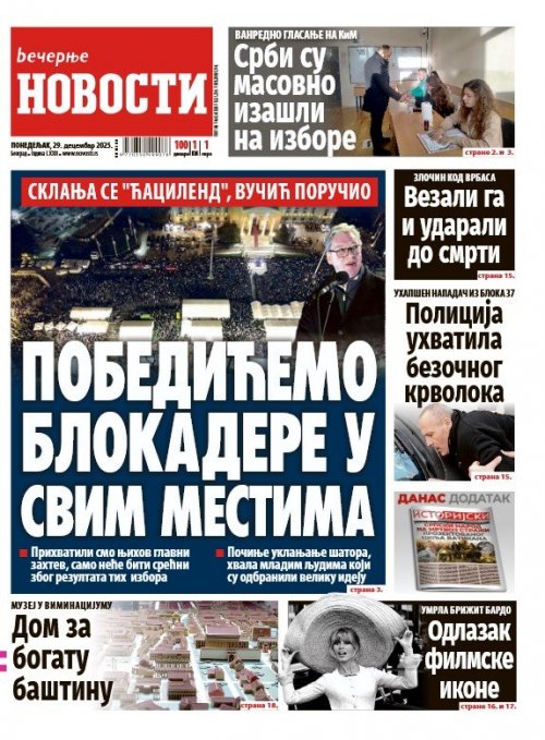 Večernje novosti - Naslovna strana - Štampano izdanje za 29.12.2025.