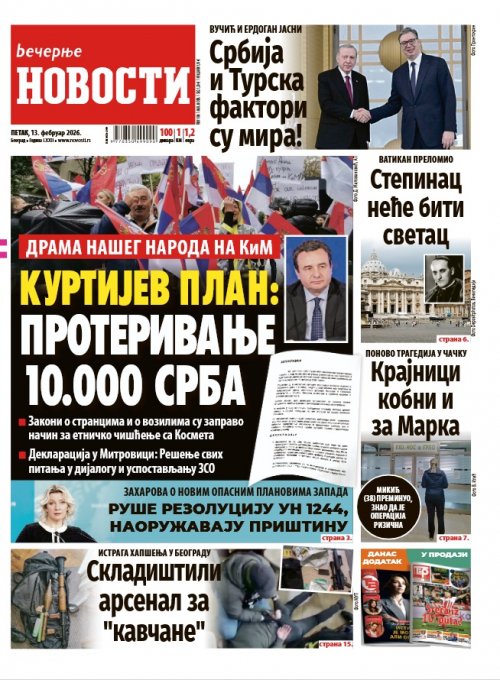 Večernje novosti - Naslovna strana - Štampano izdanje za 13.02.2026.