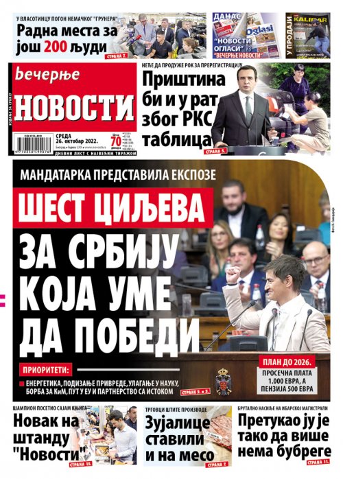 Večernje novosti - Naslovna strana - Štampano izdanje za 26.10.2022.