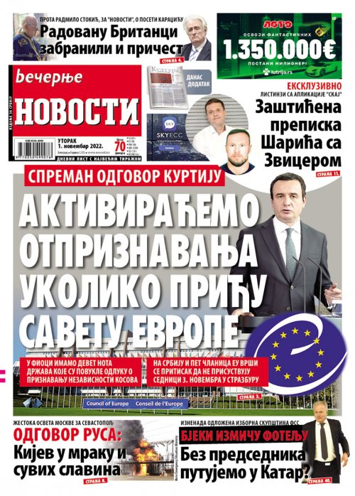 Večernje novosti - Naslovna strana - Štampano izdanje za 01.11.2022.