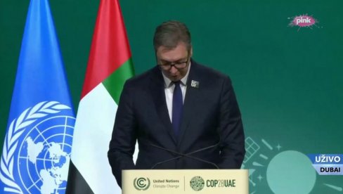 - Dugoročne potrebe za borbu protiv klimatskih promena su samo jedan deo duge strategije do 2050. godine. Pre svega potrebno je obezbediti nove zelene poslove građanima. Takođe razvijamo i novi plan za predstojeći period u kojem će biti uračunati ne samo ranjivosti od klimatskih promena, već i nova politika zaštite infrastrukture, poljoprivrede, kako bi prepoznali sve to u borbi protiv klimatskih promena. Dok je naš nacionalni progres skoro nezaustavljiv, Republika Srbija je spremna da igra veoma važnu ulogu u borbi protiv klimatskih promena u svetu. I pozivamo svetsku zajednicu da ispoštuju sve ranije dogovore kako bi ta borba bila što uspešnija. Takođe i da podele odgovornost u slučaju različitih pesimističnih scenarija. Hvala još jednom veliko šeiku Muhamedu bin Zajedu, na njegovoj ljubaznosti i gostoprimstvu. Postavlja se pitanje kako ćemo ovo rešiti, kada nismo u stanju da rešimo ni geopolitičke probleme sa kojima se suočavamo - pre svega ratovima širom sveta u poslednjem periodu. Plašim se da neke stvari nećemo moći da zaustavimo, ako ne možemo da postignemo rezultate u zaustavljanju ratova, kako možemo biti sigurni da ćemo postići i dobre rezultate u borbi protiv klimatskih promena. Verujem da svi treba da se vratimo realnim i pravim principima UN, jer moramo da delujemo u skladu sa njima, pravilima koja su prihvaćena od većine zemalja sveta i međunarodne zajednice. Ukoliko se to ne dogodi i ukoliko krenemo sa različitim pristupima, doživećemo vrlo neprijatne rezultate. Pogotovo kada je reč o teritorijalnim integritetima, što mi u Srbiji najbolje znamo, više nego drugi. Danas dam čuo više puta frazu "kada se ujedinimo". To je neki zajednički imenitelj da pronađemo put za zajedničke geopolitičke probleme, a da se tek onda bavimo problemima klimatskih promena, koji postaju veoma važni - zaključio je Vučić.