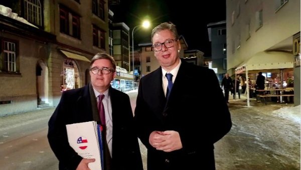 PREDSEDNIK Srbije Aleksandar Vučić razgovarao je danas na marginama Svetskog ekonomskog foruma u Davosu sa pomoćnikom državnog sekretara SAD za evropska i evroazijska pitanja Džejmsom O`Brajanom.