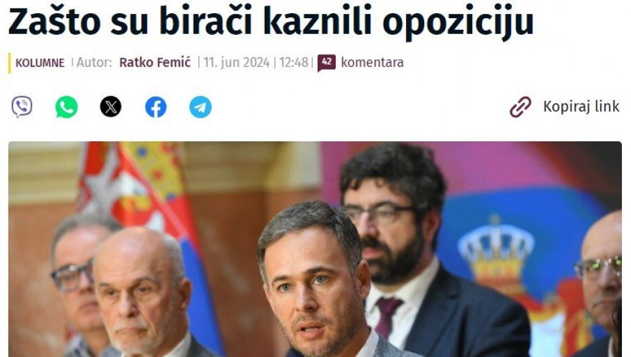 Naime, ovaj portal objavio je kolumnu pod nazivom “Zašto su birači kaznili opoziciju” u kojem se obrazlaže zbog čega je došlo do razočaranja glasača, koji su i 17. decembra bili u manjini, u opoziciju.