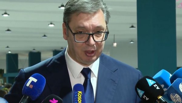 PREDSEDNIK Aleksandar Vučić se obraća iz Bakua. Vučić je između ostalog komentarisao i najavljene proteste opozicije.