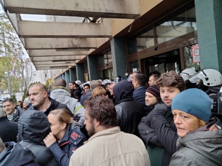 Deo opozicionih aktivista blokirao je Takovsku ulicu ispred zgrade RTS, što je izazvalo gnev mnogih Beograđana koji su izlazili iz automobila i svađali se sa organizatorima skupa. Bilo je guranja, psovki, a u jednom trenutku radio je i biber sprej. Tu je bio i Đorđe Miketić iz inicijative "Most ostaje" koji je tražio da javni servis prekine program na 15 minuta. Pokušavali su da provale u zgradu.