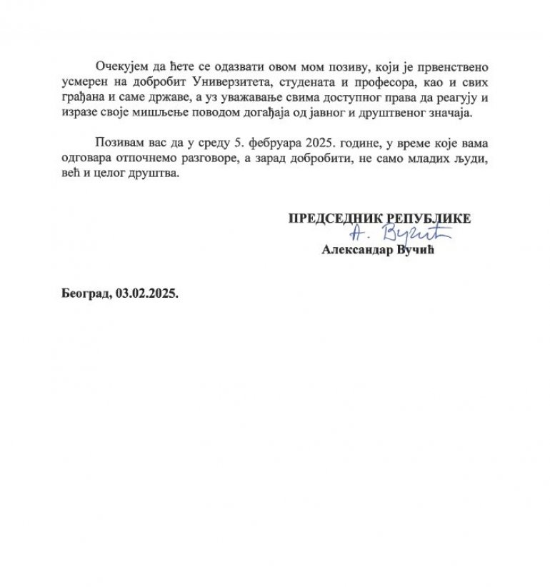 Pozivam vas da u sredu 5. februara 2025. godine, u vreme koje vama odgovara otpočnemo razgovore, a zarad dobrobiti, ne samo mladih ljudi, već i celog društva - stoji u pismu predsednika Aleksandra Vučića.