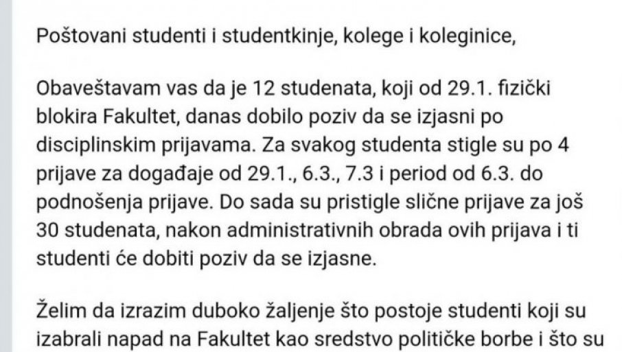 Obaveštavam vas da je 12 studenata, koji od 29.01. fizički blokira Fakultet, danas dobilo poziv da se izjasni po disciplinskim prijavama. Za svakog studenta stigle su po 4 prijave za događaje od 29.01, 06.03, 07.03. i period od 06.03. do podnošenja prijave. Do sada su pristigle slične prijave za još 30 studenata, nakon administrativnih obrada ovih prijava i ti studenti će dobiti poziv da se izjasne. Želim da izrazim duboko žaljenje pto postoje studenti koji su izabrali napad na Fakultet kao sredstvo političke borbe i što su time doveli pitanje nastavak svojih studija na Računarskom fakultetu. Izvinjavam se svim studentima koji žele normalno da studiraju što trenutno ne možemo da uspostavimo nastavu iz učionoca i damo precizne planove održavanja kolokvijuma i nadoknadu ispita. Još jednom napominjemo da ćemo, kao uprava, učiniti apsolutno sve što je u našoj moći da se nastavni proces normalizuje, i da sve bitne informacije o terminima kolegijuma i ispita dobijete na vreme."