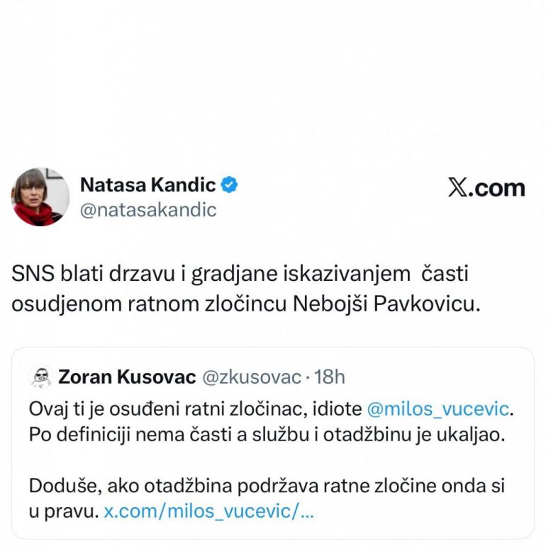 Kandić je na Iksu napisala: "SNS blati državu i građane iskazivanjem časti osuđenom ratnom zločincu Nebojši Pavkoviću".