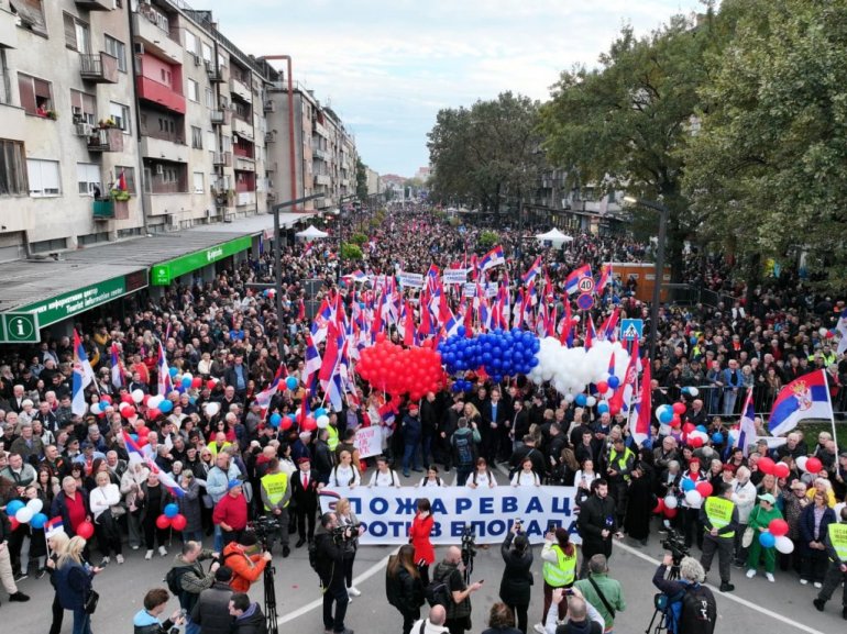 ВУЧЕВИЋ У ПОЖАРЕВЦУ СА ВЕЛИКИМ БРОЈЕМ ГРАЂАНА: Уџбенички пример обојене револуције, све преваре и трикове су испалили